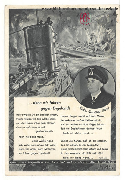 ▲독일 군가 영국 정벌가의 가사가 담긴 그림 엽서에 등장한 귄터 프린 대위. 엽서 하단에 "프린 대위는 '리펄스'를 뇌격했고 '로열 오크'를 격침시켰다"라는 설명이 적혀 있다.