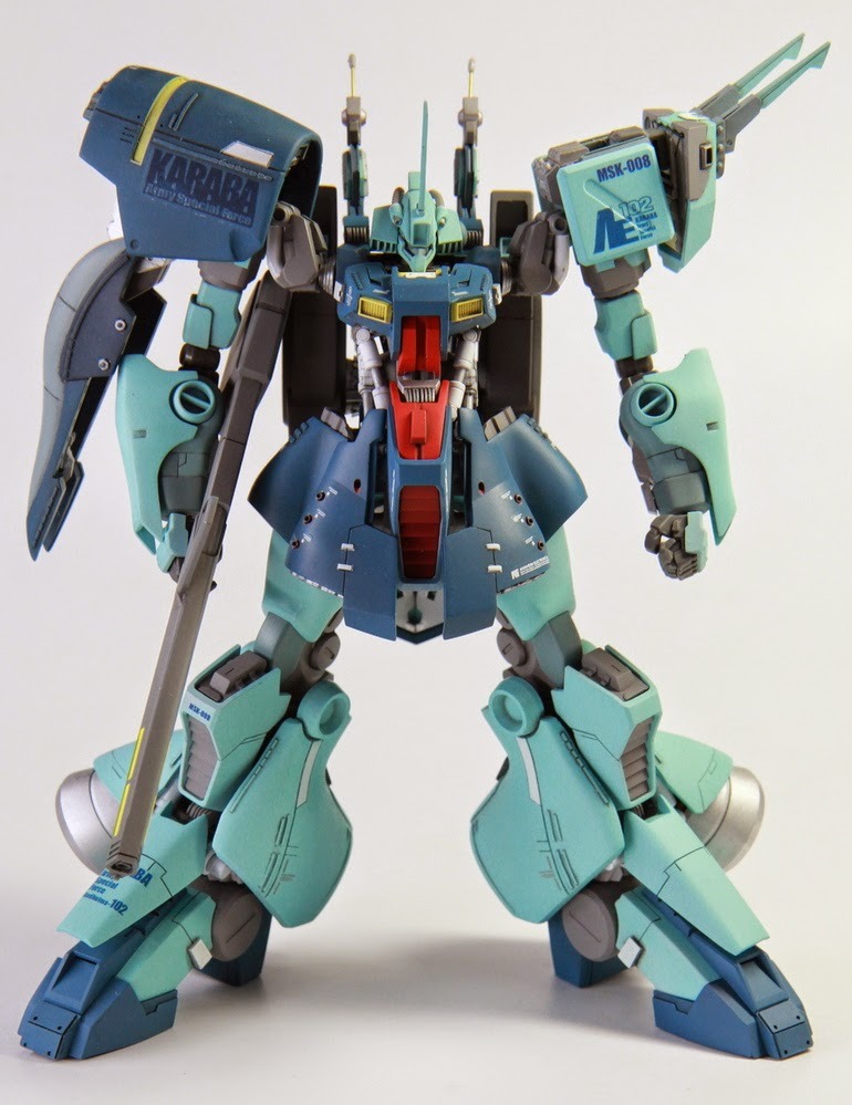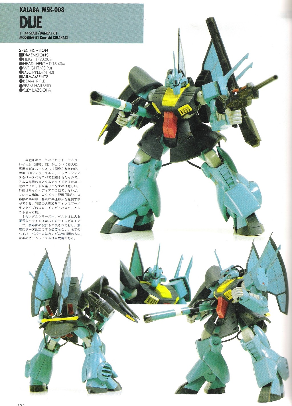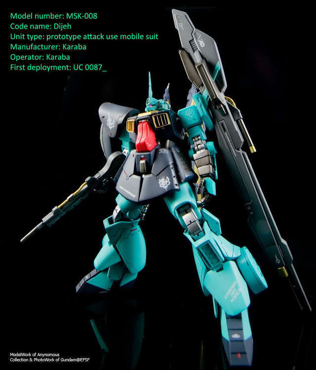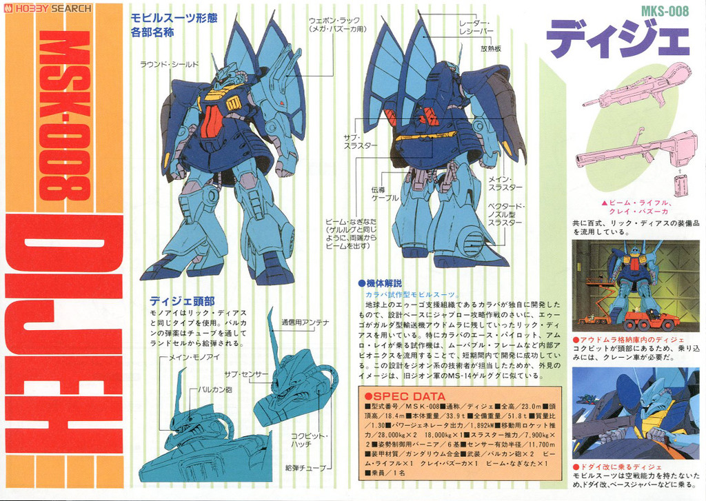 Impressed by the RMS-099 Rick Dias developed by the Anti-Earth Union Group, the AEUG's Earthside allies, Karaba, develop a new test model ground combat mobile suit based on the Rick Dias' design. This new unit is called the MSK-008 Dijeh, and despite its outward appearance, it is quite similar to the successful Rick Dias in terms of performance. Like the Rick Dias, many of the engineers who develop the Dijeh are former Zeon mobile suit manufacturer employees, and its design does incorporate many Zeon-style features, such as monoeye sensors. One of its most notable visible features are the large radiator fins mounted on its back, which also serve to give the Dijeh high performance during atmospheric flight. To help keep its cost down due to Karaba's limited resources, it employs the beam rifle used by the AEUG's MSN-00100 Hyaku-Shiki, as well as the Rick Dias' clay bazooka. For close combat, the Dijeh is armed with a beam naginata ("naginata" is Japanese for "long-handled sword"). The Dijeh prototype is assigned to Karaba's top ace pilot, Amuro Ray, who uses his new mobile suit quite well during their war against the corrupt Titans in UC 0087.