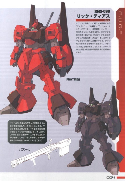 릭 디아스를 베이스로 만든 지상용 기체로, 설정상 성능면에선 릭 디아스와 큰 차이가 없다고 한다. 릭 디아스와 마찬가지로 콕핏은 머리부분에 위치하는데, 복부에 분명 탑승용 해치같은 것이 있는데다 콕핏이 들어있는 것 치고는 머리가 너무 작다. 그 이유에 대해서는 후술.