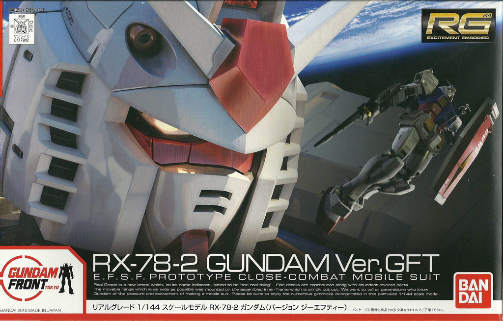 RG는 위에서 언급했듯이 오다이바 1:1 건담 모형을 본뜬 프로포션에 RG란 이름에 걸맞게 걸출한 가동성을 자랑하며 코어파이터를 코어블록으로 변환해 내장할 수도 있고 랜딩기어도 있는 등 다양한 기믹을 가지고 있지만 첫 RG라서 장갑의 고정성이 참으로 암담한 수준이다. 각 부의 장갑들(특히 스커트)이 포징을 잡기위해 조금만 움직여줘도 후두둑 떨어졌으나자동 내부 프레임 노출 재판본부터는 개선이 되었고, 관절 강도 역시 비약적으로 상승했다. 다만 초기킷이기 때문에 타 RG시리즈에 비해서 조립의 편의성이 좋은 편은 아니다. 그리고 건담 해머나 네이팜은 들어있지 않다. 그래도 1:144 스케일에 사상 최초로 구현된 전신 내부 프레임과 도색이 거의 필요없을 정도의 세밀한 부품 분할과 데칼 등은 호평받았다.