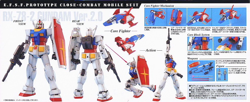 코어파이터도 완벽하게 업그레이드 되었다. 기수를 접으면 수직미익이 연동되어 접히는 기믹이 MG 건담 최초로 도입되었으며[37], 코어 파이터의 미사일 런처 개폐도 구현되었다. 기수 끝부분도 신축되는데, 길이를 줄일경우 콕핏이 연동되어 90도 뒤로 넘어가서 하체와 합체했을 때 파일럿이 아래가 아니라 앞을 바라보는 상태의 구현이 가능하다.[38] 보너스로 PG에도 없던 날개 연장기믹도 들어가있다. 이것만 제외하면 사실 모두 PG에 있었던 기믹이지만 2.0에 이르러 MG에서도 구현되면서 크게 환영받았다.