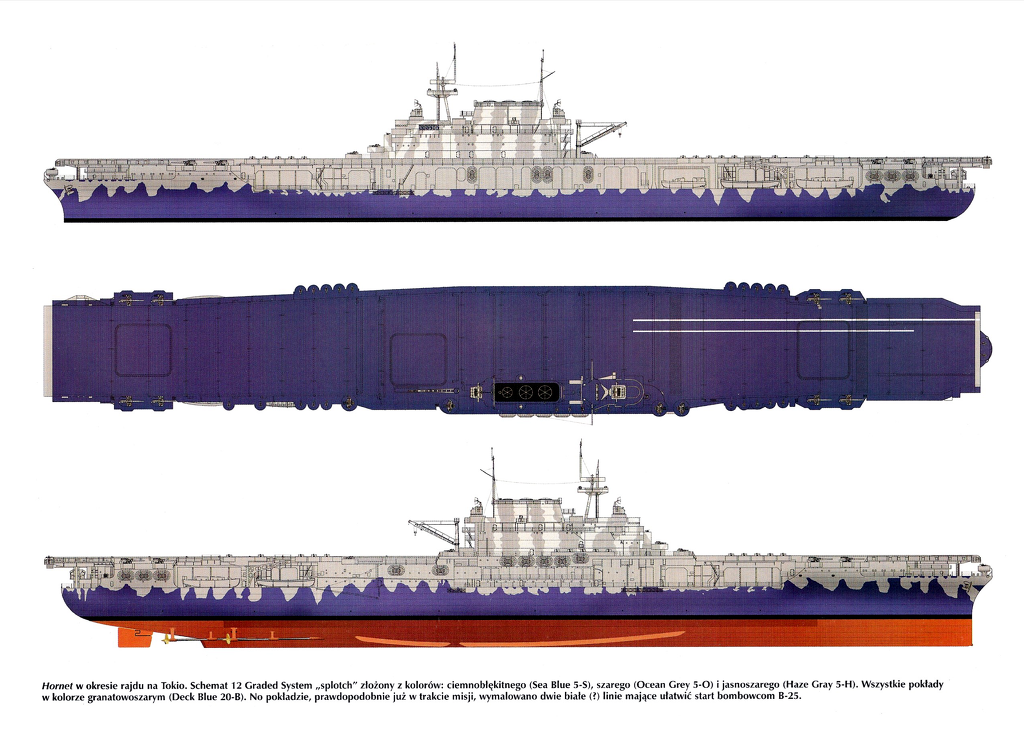 [1942년 이후 측면의 검정과 회색 3 칼러로 도장되어졌으며 갑판은 바다색과 비슷한 푸른색으로 칠해졌다]