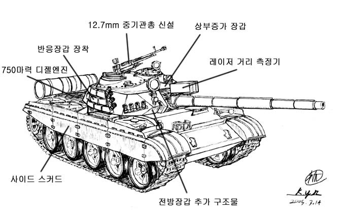[T-62 전차는 북한군이 주력전차로 장비하고 있는 천마호 전차로도 유명하다 윗 사진은 행군중인 천마호 전차의 모습과 이를 바탕으로 구성해본 모습이다. 러시아아가 최근 개량한 T-62 개량형과 매우 흡사하다. 하지만 전체적인 성능은 한국군이 장비한 K1 전차에는 훨씬 못미치는 성능이고 M48A5K 정도에 맞설 정도로 평가 받고 있다]