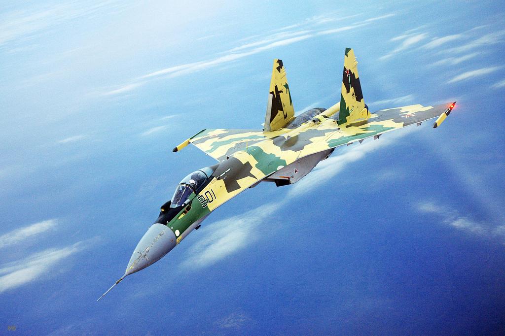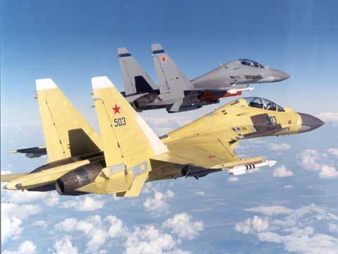 [구소련연방의 붕괴로 한동안 경제적으로 어려움을 겪던 러시아가 최근 나아진 경제사정에 힘입어 차기 주력전투기로 개발중인것이 사진의 SU-35 수퍼플랭커 이다. 이는 수호이 27 전투기의 최고 단점이였던 레이더 성능과 화기관제 장비 그리고 열악한 조종석 환경을 개선한 것으로 추력이 향상되고 추력변환 노즐을 탑재하여 비행성능면으로도 더 우수한 기체로 재탄생하였다]