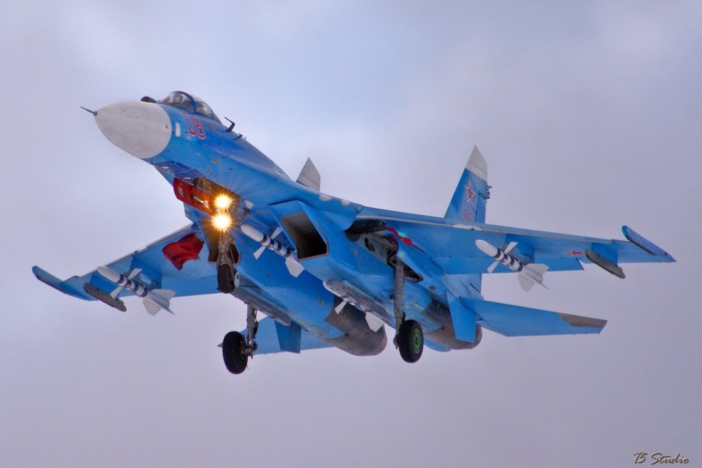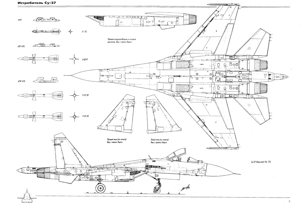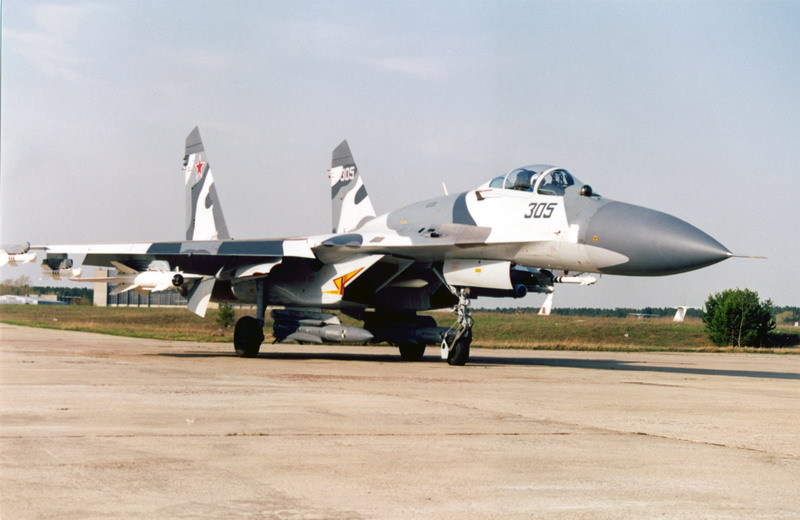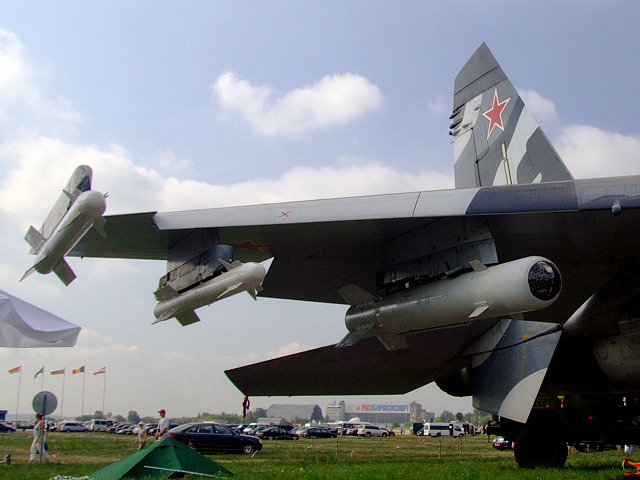 [수호이-27의 놀라운 무장탑재력을 잘 보여주는 사진중 하나로 동체와 주익에 무려 10발의 다양한 미사일을 탑재하고도 우수한 비행성능을 보여주는 수호이사의 기체는 이후 서방제 전투기들의 경계1호로 비행성능면에서는 이미 서방제 전투기들으 압도하고 남는다는것을 잘 보여주고 있다. 이런 중무장이 가능한 서방제 기체로는 F-15E 나 F/A-18E 수퍼호넷 유로파이터 그리고 랩터 등이나 가능한 것으로 그만큼 수호이27의 기본 설계가 우수함을 잘 보여주는 예라 하겠다]