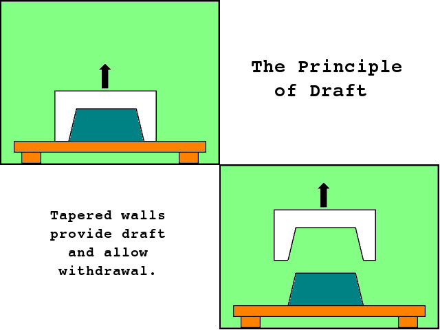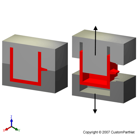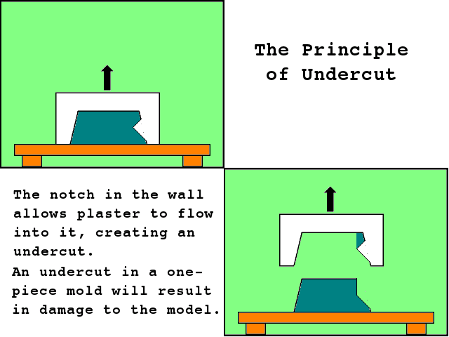 [위 두그림은 언더컷에 대해 잘 설명한 그림으로 대량생산에 편리한 사출금형방법의 맹점이 바로 복잡한 모양을 그대로 사출할수 없는 언더컷 이다. 언더컷은 현재까지 금속금형을 이용한 사출금형의 기술적 한계로 달리 해결할 방법이 없다]