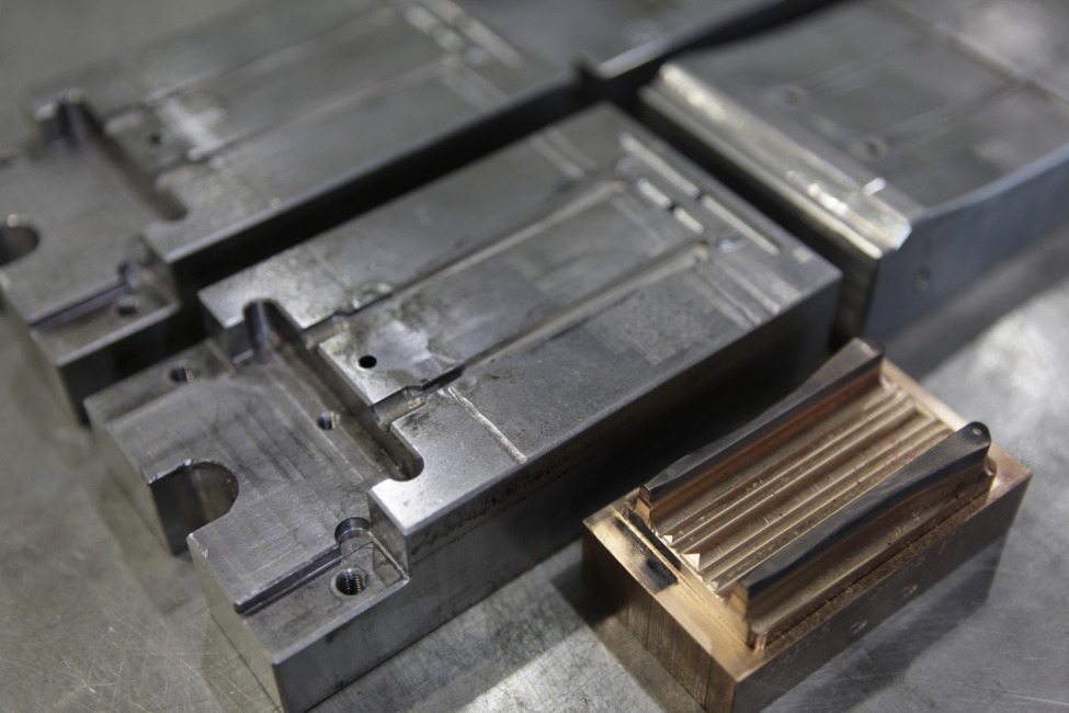 [금형을 물려 사출해내는 모습 사출금형 방식은 대량생산에 적합하지만 투자비용이 크다는 문제점이 있다]