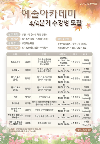 [부산예총] 예술아카데미 수강생 모집 (4분기) 작성자부산예총|작성시간12.09.24|조회수12 목록 댓글 1 글자크기 작게가 글자크기 크게가 * 추천 : '대한민국 속의 민요' 는 전래 민요를 장구 자락에 맞춰 우리가락을 배울 수 있는 강좌로 (사)부산국악협회 '김영애' 회장님의 강의로 한층 품격을 높였습니다. * 문의 : 예술회관 기획실 051-631-1377 * 예사모 회원은 각 강좌당 10% 할인 가능 다음검색 현재 게시글 추가 기능 열기 북마크 공유하기 신고 센터로 신고 댓글 댓글 1 댓글쓰기 답글쓰기 댓글 리스트 작성자화려한 얼짱 | 작성시간 12.09.27 퇴근후 하는 시간이 있으면 좋겠습니다... 댓글 전체보기