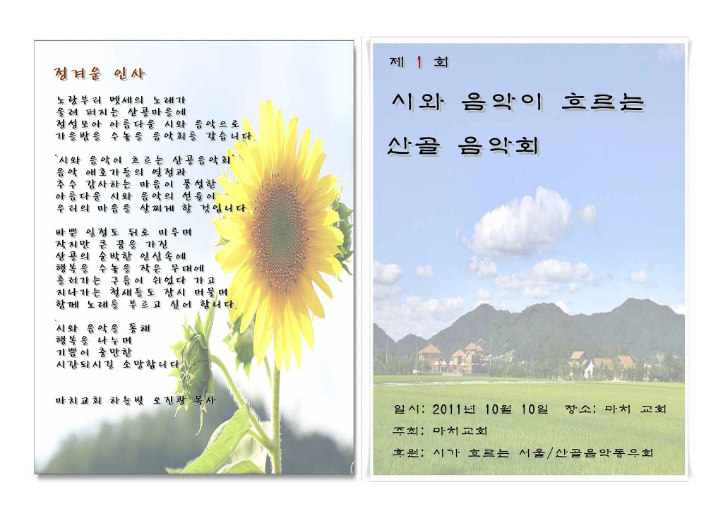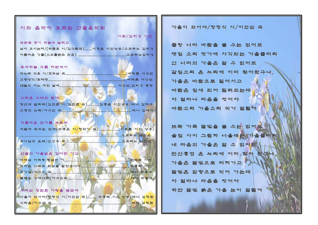 제1회 시가 흐르는 산골 음악회 작성자정덕기|작성시간11.10.05|조회수19 목록 댓글 0 글자크기 작게가 글자크기 크게가 일시: 2011년 10월 10일 장소: 마치교회 프로그램 세월에 띄우는 빈배 (작시 박종은 작곡 정덕기 소프라노 김인순)외 다음검색 현재 게시글 추가 기능 열기 북마크 공유하기 신고 센터로 신고 댓글 댓글 0 댓글쓰기 답글쓰기 댓글 리스트