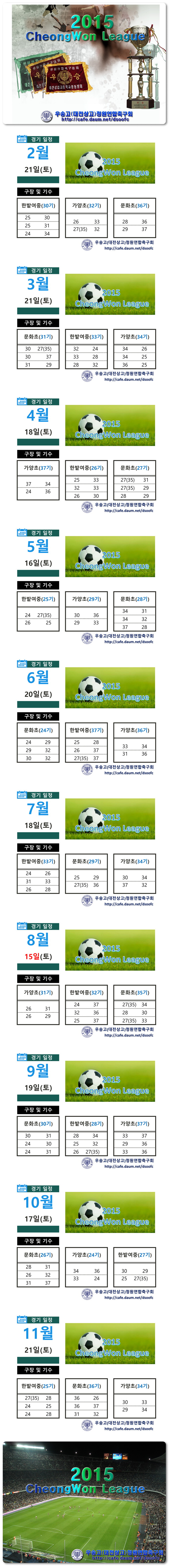 [스크랩] 2015년도 청원연합축구회 리그전 일정표 작성자이경일|작성시간15.02.11|조회수34 목록 댓글 0 글자크기 작게가 글자크기 크게가 "대진표 클릭시 원본크기로 보실 수 있습니다." 첨부파일첨부된 파일이 3개 있습니다. swf 파일 2015 CHEONGWON FootBall Association League (800x450).swf 다운로드 png 파일 2015년도 청원연합축구회 리그전 일정표 (간편형).png 다운로드 png 파일 2015년도 청원연합축구회 리그전 일정표.png 다운로드 다음검색 스크랩 원문 : 청원연합축구회 현재 게시글 추가 기능 열기 북마크 공유하기 신고 센터로 신고 댓글 댓글 0 댓글쓰기 답글쓰기 댓글 리스트