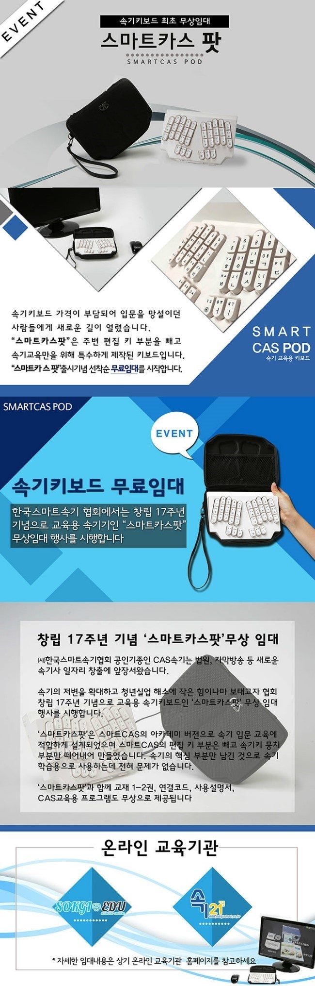 한국스마트속기협회에서는 창립 17주년 기념으로 교육용 속기키보드인 스마트카스팟 무료임대를 시행합니다~~