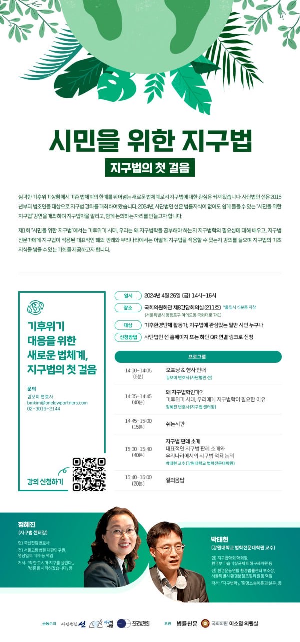 제가 회원으로 있는 '지구와사람'에서 2024년 지구의 날을 맞아 시민을 위한 지구법 강연회를 엽니다. 공익사단법인 선과 함께 하는 제1회 강연회입니다. 신청과 문의는 아래 링크와 전화번화를 참고하세요.