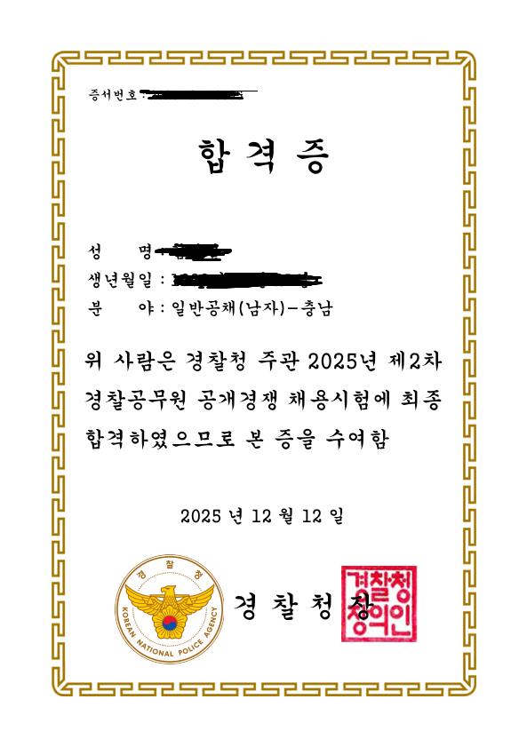 감사합니다 합격했습니다. 충남. 작성자페이커 기습숭배|작성시간25.12.12|조회수113 목록 댓글 3 글자크기 작게가 글자크기 크게가 헌법 수업 듣는 동안 많은 것을 배웠습니다. 자만하지 않고 겸허한 마음가짐을 가지고 훌륭한 경찰관이 되겠습니다. 감사합니다. 다음검색 현재 게시글 추가 기능 열기 북마크 공유하기 신고 센터로 신고 댓글 댓글 3 댓글쓰기 답글쓰기 댓글 리스트 작성자윤우혁 | 작성시간 25.12.12 축하 합니다 주소 이름 폰번호 남겨주세요 해당 댓글은 작성자와 운영진만 볼 수 있습니다. 해당 댓글은 작성자와 운영진만 볼 수 있습니다. 댓글 전체보기