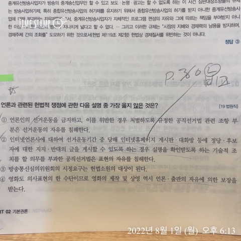 기출 364p 24번 2번질문 작성자ksm6281|작성시간22.08.01|조회수21 목록 댓글 2 글자크기 작게가 글자크기 크게가 이문제 2번만 침해 안한다고 하는데 익명표현의 자유 침해 아니고 그냥 표현의 자유 침해라고 해서 안되는건가요? 다음검색 현재 게시글 추가 기능 열기 북마크 공유하기 신고 센터로 신고 댓글 댓글 2 댓글쓰기 답글쓰기 댓글 리스트 작성자윤우혁 | 작성시간 22.08.01 침해 입니다 답댓글 작성자ksm6281 작성자 본인 여부 작성자 | 작성시간 22.08.04 답은 침해 아니라고 되어있습니다 잘못 나와있는건가요?? 댓글 전체보기