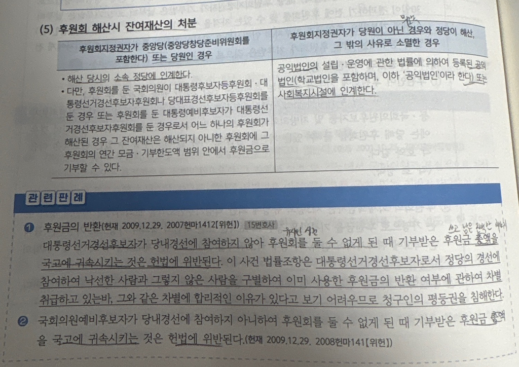 밑에 두 판례는 경선 참여 안해서 후원회 둘 수 없게되는경우 국고 귀속이라고 돼있는데 총액 귀속시켜서 헌법에 위반 된다는 논점과 별개로 후원회 해산시 잔여재산 처분에서 당원인 자는 소속 정당에 인계 무소속은 공익법인또는 사회복지시설에 인계로 둘 다 국고 귀속 되는 경우는 없는거같은데 후원회 해산이랑 선거 참여 안해서 후원금 반환하는거랑은 다른건가요?