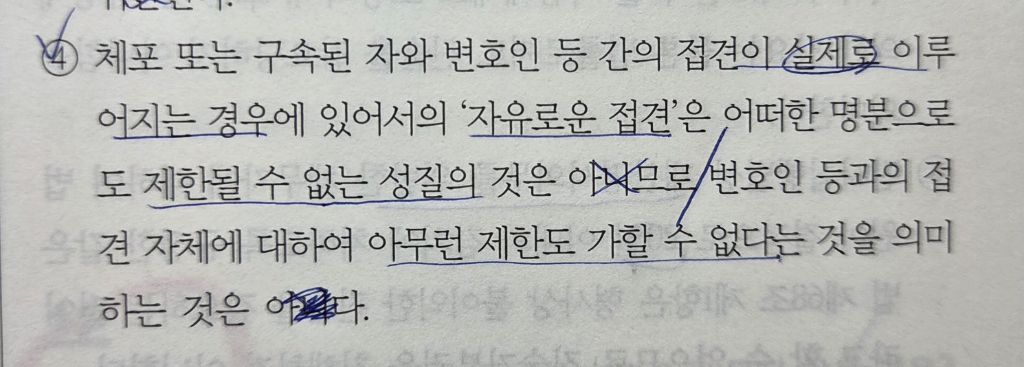 질문 있어요 작성자합껴억|작성시간26.02.16|조회수11 목록 댓글 1 글자크기 작게가 글자크기 크게가 선생님 이거 전모 5회 6번에 4번 지문인데요, '자유로운 접견은 어떠한 명분으로도 제한될 수 있는 성질의 것은 아니므로'가 맞지 않나요?? 답지에 맞는 걸로 나와있어서요 다음검색 현재 게시글 추가 기능 열기 북마크 공유하기 신고 센터로 신고 댓글 댓글 1 댓글쓰기 답글쓰기 댓글 리스트 작성자윤우혁 | 작성시간 26.02.16 대화 내용을 듣는건 절대 안되지만 시간이나 장소제한은 가능합니다 상대적으로 보세요 댓글 전체보기