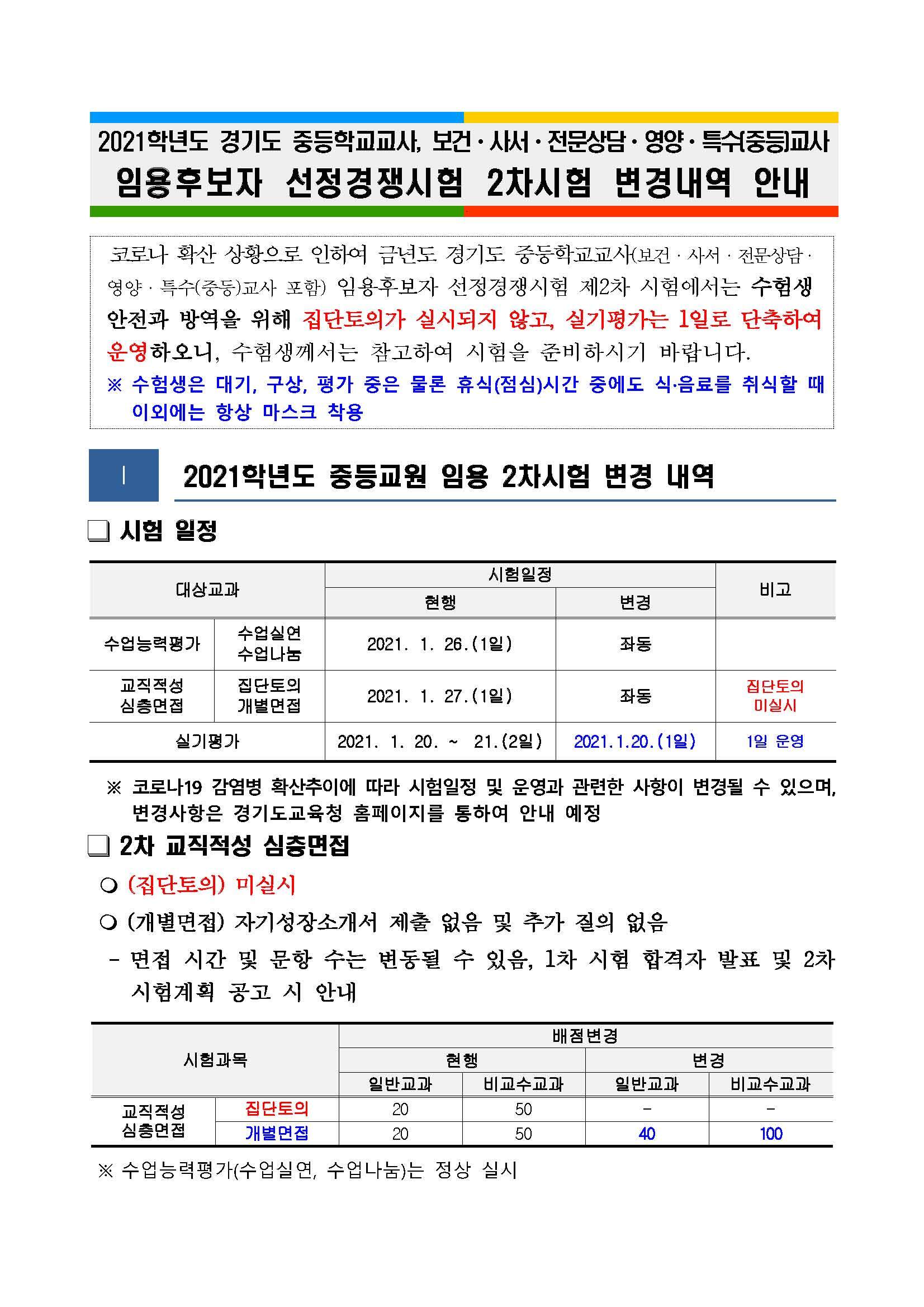 2021학년도 중등학교교사, 보건ㆍ사서ㆍ전문상담ㆍ영양ㆍ특수(중등)교사 임용후보자 선정경쟁시험 2차 시험 변경내역을 붙임과 같이 안내합니다.