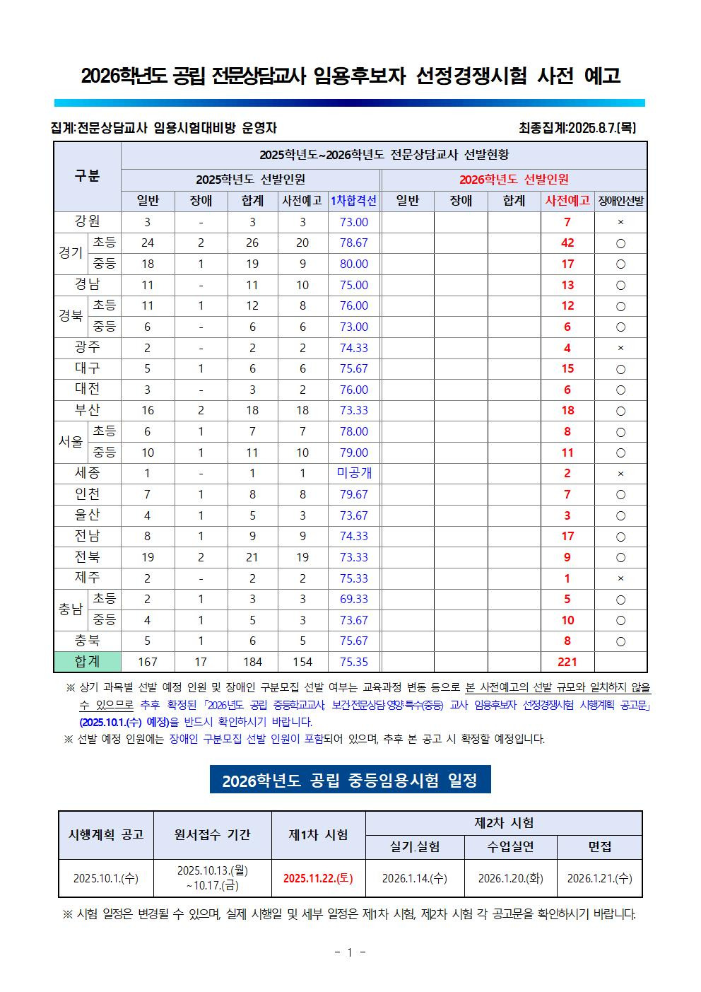 2026학년도 전문상담교사 임용시험 선발인원 사전 예고(전국221명) 작성자선구자(李 貞)|작성시간25.08.07|조회수3,264 목록 댓글 0 글자크기 작게가 글자크기 크게가 #2026학년도임용시험 #전문상담교사 #교사임용 #임용고시 #임용 #중등교사 #초등교사 #비교수교과 2026학년도 전문상담교사 임용시험 선발인원 사전예고.pdf86.68KB2026학년도 공립 전문상담교사 임용시험 선발인원 사전예고 /전국 221명 ★2026학년도 부산광역시 공립 중등학교교사, 보건 사서 전문상담 영양 특수(중등)교사 임용후보자 선정경쟁시험 사전예고.pdf350.80KB2026학년도 경상남도 공립 중등학교교사_ 보건.사서.전문상담.영양.특수(중등)교사 임용후보자 선정경쟁시험 사전 예고.pdf249.80KB강원_붙임_2026학년도 강원특별자치도 공립 중등학교교사, 보건·사서·전문상담·영양·특수(중등)교사 임용후보자 선정경쟁시험 사전 예고.hwpx79.77KB경기_2026학년도 경기도 공립 중등학교 교사 보건·사서·전문상담·영양·특수(중등)교사 임용후보자 선정경쟁시험 변경사항 사전 안내문.pdf75.16KB경북_2026학년도 중등교사 임용후보자 선정경쟁시험 사전예고(공고).pdf183.19KB광주_2026학년도중등교사임용후보자선정경쟁시험사전예고.pdf229.40KB대구_2026학년도 중등교사 임용후보자 선정경쟁시험 사전 예고.pdf296.25KB대전_2026학년도+중등교사+임용후보자+선정경쟁시험+사전예고.hwp133.50KB서울_2026학년도 공립 중등학교교사_ 특수(중등) 보건 영양 사서 전문상담교사 임용후보자 선정경쟁시험 사전예고(게시용).pdf169.43KB세종_2026학년도 공립 중등학교교사, 보건·사서·전문상담·영양·특수(중등)교사 임용후보자 선정경쟁시험 사전 예고.pdf259.74KB울산_2026학년도 공립 중등교사 임용후보자 선정경쟁시험 사전예고(최종-게시용).hwpx98.57KB인천_[공고] 2026학년도 중등 임용 사전예고 안내문.pdf157.45KB전남_2026학년도 전라남도 공립 중등학교교사 임용후보자 선정경쟁시험 사전예고.hwp93.50KB전북_★(공고)2026학년도중등임용시험사전예고공고문★.hwp153.50KB제주_★2026학년도+중등+사전예고문.pdf204.09KB 첨부파일첨부된 파일이 19개 있습니다. png 파일 itd_ysh_2022_01-2.png 다운로드 etc 파일 강원_붙임_2026학년도 강원특별자치도 공립 중등학교교사, 보건·사서·전문상담·영양·특수(중등)교사 임용후보자 선정경쟁시험 사전 예고.hwpx 다운로드 pdf 파일 경기_2026학년도 경기도 공립 중등학교 교사 보건·사서·전문상담·영양·특수(중등)교사 임용후보자 선정경쟁시험 변경사항 사전 안내문.pdf 다운로드 pdf 파일 경북_2026학년도 중등교사 임용후보자 선정경쟁시험 사전예고(공고).pdf 다운로드 pdf 파일 2026학년도 경상남도 공립 중등학교교사_ 보건.사서.전문상담.영양.특수(중등)교사 임용후보자 선정경쟁시험 사전 예고.pdf 다운로드 pdf 파일 ★2026학년도 부산광역시 공립 중등학교교사, 보건 사서 전문상담 영양 특수(중등)교사 임용후보자 선정경쟁시험 사전예고.pdf 다운로드 pdf 파일 광주_2026학년도중등교사임용후보자선정경쟁시험사전예고.pdf 다운로드 pdf 파일 대구_2026학년도 중등교사 임용후보자 선정경쟁시험 사전 예고.pdf 다운로드 pdf 파일 세종_2026학년도 공립 중등학교교사, 보건·사서·전문상담·영양·특수(중등)교사 임용후보자 선정경쟁시험 사전 예고.pdf 다운로드 hwp 파일 대전_2026학년도+중등교사+임용후보자+선정경쟁시험+사전예고.hwp 다운로드 pdf 파일 서울_2026학년도 공립 중등학교교사_ 특수(중등) 보건 영양 사서 전문상담교사 임용후보자 선정경쟁시험 사전예고(게시용).pdf 다운로드 etc 파일 울산_2026학년도 공립 중등교사 임용후보자 선정경쟁시험 사전예고(최종-게시용).hwpx 다운로드 pdf 파일 인천_[공고] 2026학년도 중등 임용 사전예고 안내문.pdf 다운로드 hwp 파일 전북_★(공고)2026학년도중등임용시험사전예고공고문★.hwp 다운로드 hwp 파일 전남_2026학년도 전라남도 공립 중등학교교사 임용후보자 선정경쟁시험 사전예고.hwp 다운로드 pdf 파일 제주_★2026학년도+중등+사전예고문.pdf 다운로드 png 파일 main_ysh_0708-n.png 다운로드 jpg 파일 2026학년도 전문상담교사 임용시험 선발인원 사전예고001.jpg 다운로드 pdf 파일 2026학년도 전문상담교사 임용시험 선발인원 사전예고.pdf 다운로드 다음검색 현재 게시글 추가 기능 열기 북마크 공유하기 신고 센터로 신고 댓글 댓글 0 댓글쓰기 답글쓰기 댓글 리스트