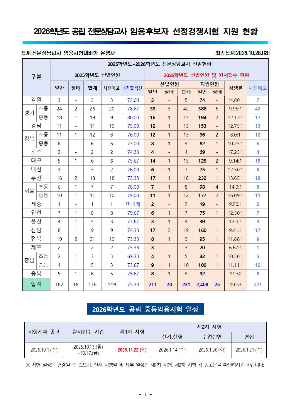 2026학년도 전문상담교사 임용시험 선발현황(전국231명_장애포함) 작성자선구자(李 貞)|작성시간25.10.28|조회수1,123 목록 댓글 0 글자크기 작게가 글자크기 크게가 #2026학년도 전문상담교사 임용시험 선발인원 및 원서접수 지원현황 다음검색 현재 게시글 추가 기능 열기 북마크 공유하기 신고 센터로 신고 댓글 댓글 0 댓글쓰기 답글쓰기 댓글 리스트