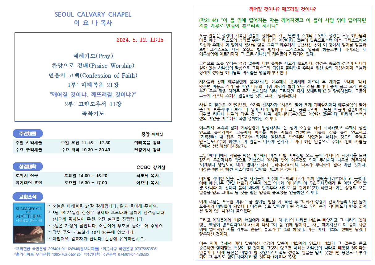 그리고 제자들에게 “내가 너희에게 이르노니 하나님의 나라를 너희는 빼앗기고 그 나라의 열매 맺는 백성이 받으리라”(43) 하시며 다시 “이 돌 위에 떨어지는 자는 깨어지겠고 이 돌이 사람 위에 떨어지면 저를 가루로 만들어 흩으리라” (44) 하셨다. 이는 이제 너희의 선택만 남았다 말씀하신 것이다.