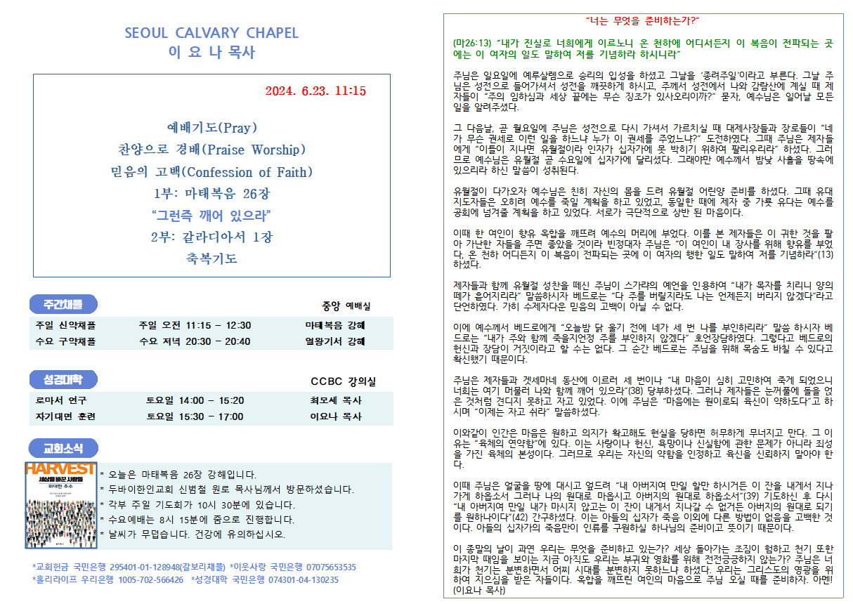 이 종말의 날이 과연 우리는 무엇을 준비하고 있는가? 세상 돌아가는 조짐이 험하고 천기 또한 마지막 때임을 보이는 지금 아직도 우리는 부귀와 영화를 위해 전전긍긍하지 않는가? 주님은 너희가 천기는 분변하면서 어찌 시대를 분변하지 못하느냐 하셨다. 우리는 그리스도의 영광을 위하여 지으심을 받은 자들이다. 옥합을 깨뜨린 여인의 마음으로 주님 오실 때를 준비하자. 아멘! (이요나 목사)