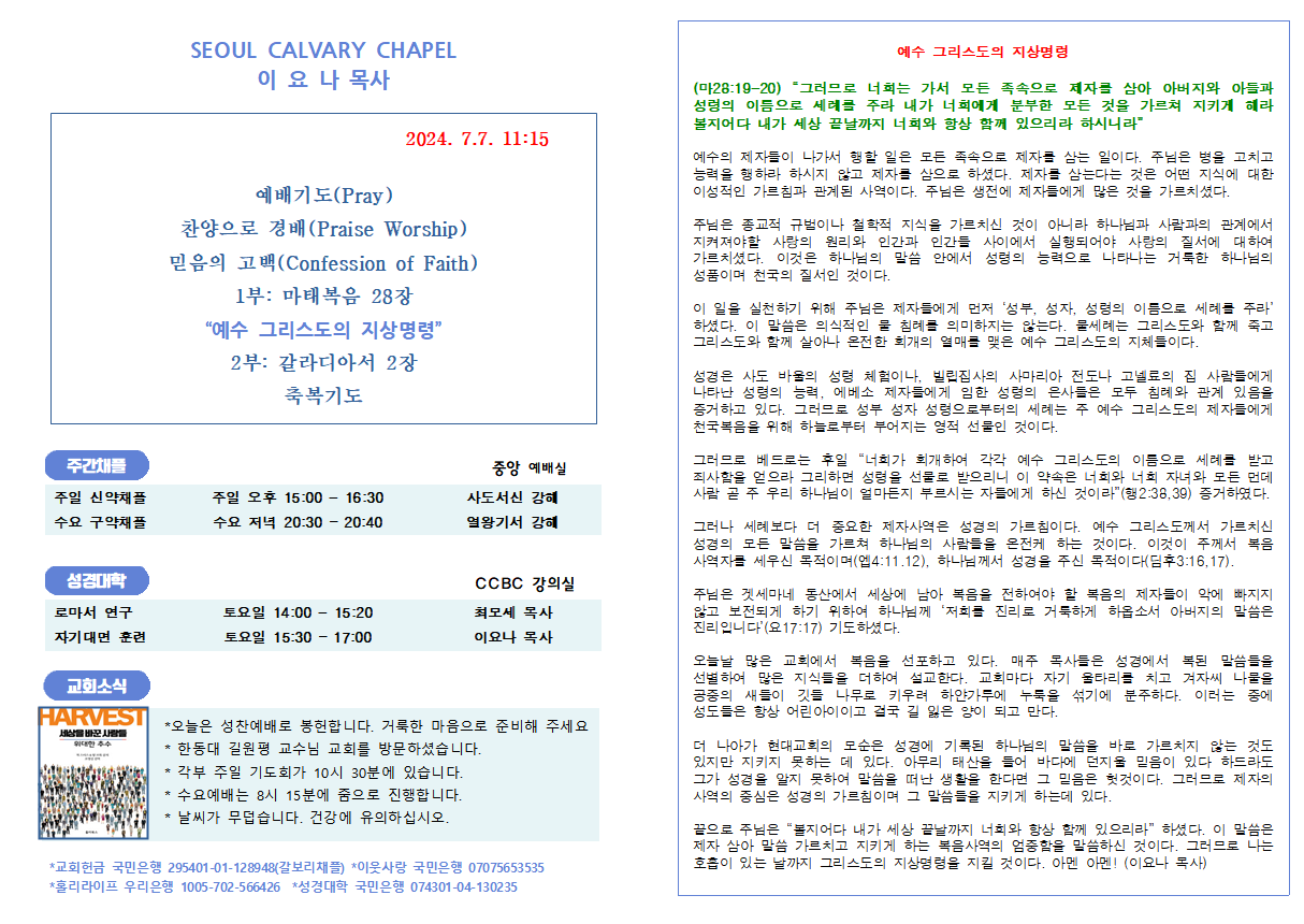 (마28:19-20) “그러므로 너희는 가서 모든 족속으로 제자를 삼아 아버지와 아들과 성령의 이름으로 세례를 주라 내가 너희에게 분부한 모든 것을 가르쳐 지키게 해라 볼지어다 내가 세상 끝날까지 너희와 항상 함께 있으리라 하시니라”