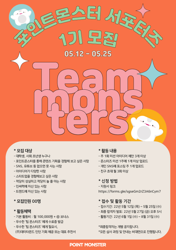 온라인 포인트몬스터 서포터즈, 팀 몬스터즈를 모집합니다. *˙ㅛ˙*