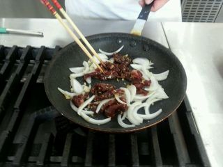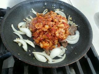 팬에 기름을 두르고 마늘은 볶다가 양파를 넣고 잠깐볶은후에 쇠고기를 넣고
