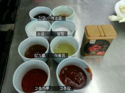 간장 , 깨소금 , 설탕 , 후추 , 참기름 , 고추장 , 고춧가루