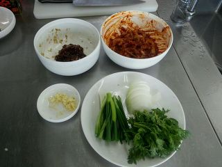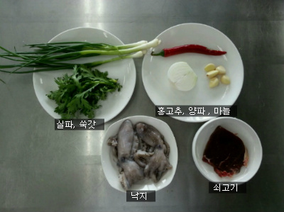 낙지 2~3 마리(500g) , 쇠고기(등심) 100g , 실파 50g, 쑥갓 50g, 양파 1/2, 홍고추 1ea , 마늘 , 대파