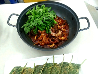 완성된 낙지전골 쪽파와 쑥갓의 위치가 이쁘지가 않아요...