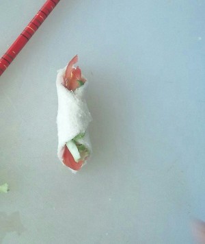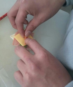 5. 식빵위에 햄, 치즈, 치커리, 토마토(채썬것)을 올리고 돌돌 말아준다.
