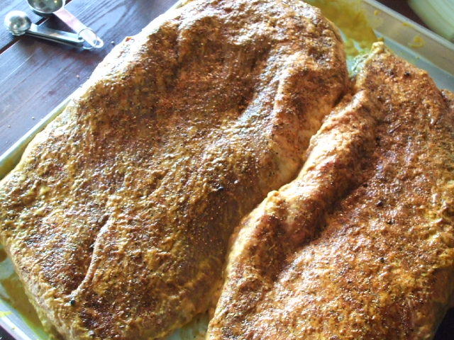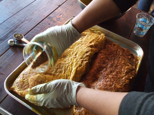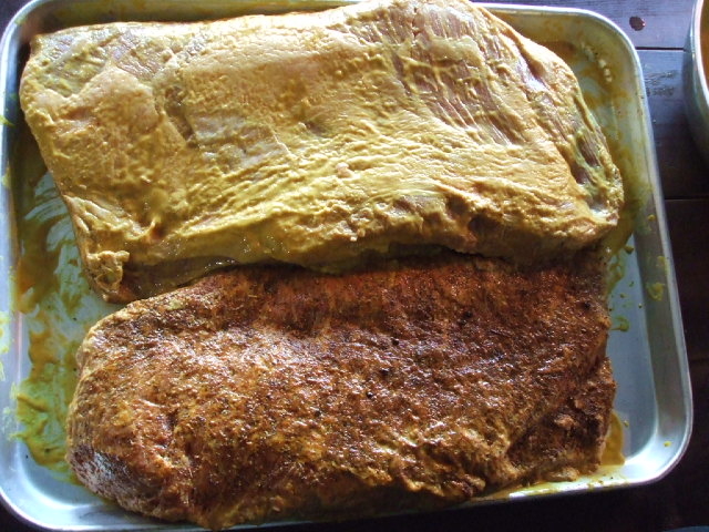 1. 머스타드 슬레이터(허니머스타드를 중심으로 향신료를 적당히 섞는다)와 럽(소고기전용럽 또는 케이준)하기