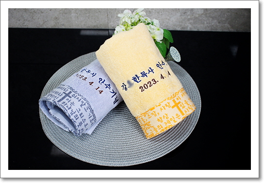 그래서 주님의 말씀이 있는 성경구절말씀수건 위에 목사 성함과 날짜를 목사안수기념수건 문구로 사용을 하는것입니다 주님의 뜻으로 목사가 되는것을 입증을 하는것이고