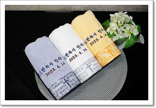 그래서 수건을 제작후 수건케이스포장 필수+ 고급선물용포장지포장 필수 + 안수 임직 스티커 제작 필수 로 해서 부찫후 드리는게 가장 고급스럽고 정성스럽습니다