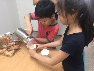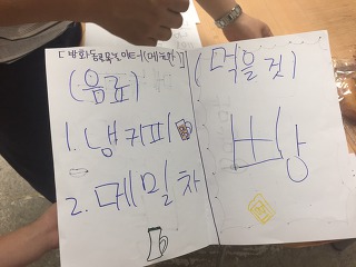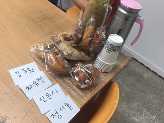 “안녕하세요. 저는 OOO입니다. 음료는 시원한 커피와 메밀차가 있구요, 먹을 것으로는 빵을 준비했습니다. 어떤 걸 드시겠어요?”
