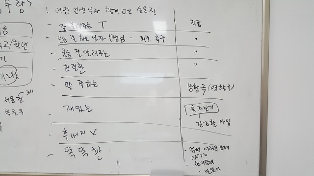 잘 놀아주는 선생님, 운동 잘하는 남자 선생님, 재미있는 선생님, 똑똑한 선생님 등 다양한 의견을 이야기했습니다. 면접 질문지를 만들기 위해서는 어떤 방식으로 위 내용을 확인할 수 있을지 조금 더 구체적으로 이야기 나눌 필요가 있었습니다.