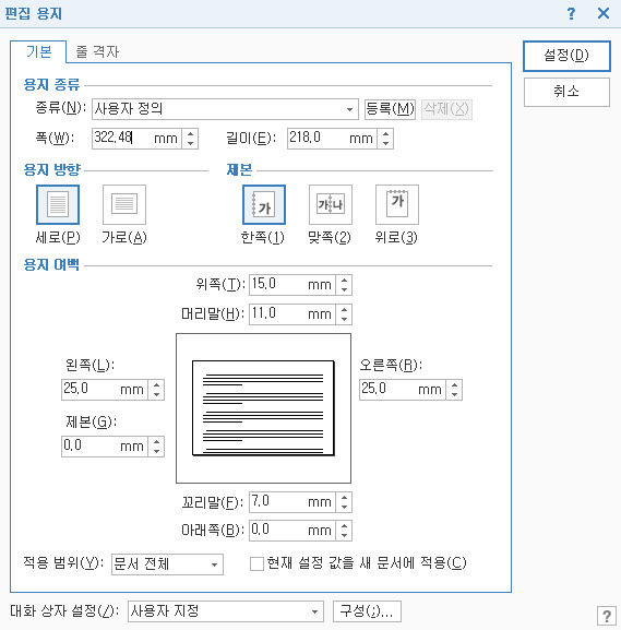 아래한글 작업 크기를 '322.48'로 만들고 표지를 (표만들기로)그립니다.