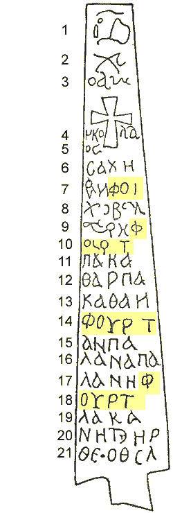 | ▲ 그리스어로 기록된 코카서스 쩨렌추크에서 발견된 비문 -이상하게도 그 그리스문자는 그리스어로 뜻이 통하지 않았다고 한다. 모스크바 대학의 민속학교수이자 소련 사회과학 아카데미 회원인 밀러(Vs. Miller)박사는 묘비의 그리스문자를 빌려 쓴 그 언어에 분명히 오세티안,(체첸, 잉구세테아지역)어로 볼 수 있는 몇몇 어휘들이 반복해서 등장함을 보고 오세티안 언어라는 것을 알게 되었다(설총의 이두문자처럼 그리스어를 소리음으로 빌려 쓴 것 ).6,7,8라인에 X....(흐,하)로 시작되는 자의 아들 '박달'Bakatar이 보인다. Χ. .. . ρη φουρτ ΪΙακαθαρ ( X....의 아들 Bakatar)이다. 여기서 '박타르'란 유라시아 대륙을 석권하여 '흉노제국'을 건설한 박타르 왕을 의미한다.단군(檀君, 檀은 '박달나무'단이다)도 퉁구스 말로 '박타르'로 발음되는데 박타르는 '영웅'을 의미한다. 코카서스 오세티아에는 7명의 아들을 둔 왕 박달의 전설이 있다. Os-Bagatar이 바로 그 주인공 | | [자료]단군.배달.흉노의 어원
