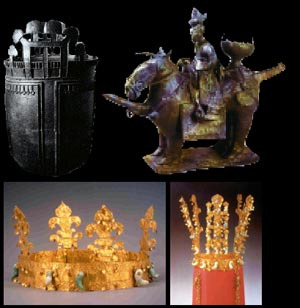 | ▲ 흉노족이 사용한 동복과 이 동복을 말 잔등에 올려놓은 경주 금령총에서 출토된 기마인물상 토기. 국보 188호 경주 천마총 금관에서는 사슴뿔형 장식과 나무 형상의 出자 장식이 보인다. 김해지역에서 출토된 왕관. 이 금관은 편두를 한 남자 머리에 맞을 정도로 작은 것이 특징이다(왼쪽부터 시계 방향). | |