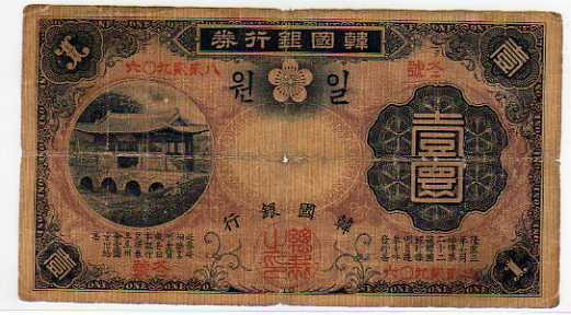 1909년 구 한국은행이 설립된후, 1910년 8월 강제 병합후에도, 한국은행을 통해 대한제국의 정식화폐 단위인 원(圜) 지폐가 1912년 까지 발행되었습니다.