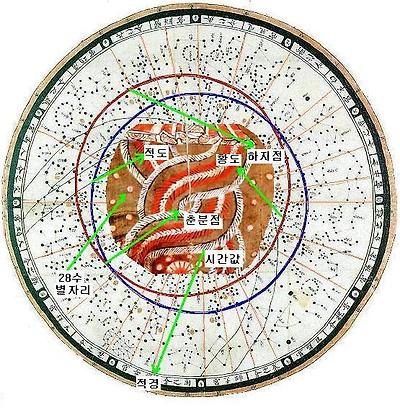 천문도상의 황도(해의 진행로)는 적위0도를 중심으로 춘분과 추분을 기점으로 안팎으로 그려진다.