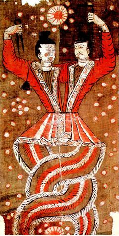 복희와 여와가 뱀의 형상으로 꼬여있는 모습,