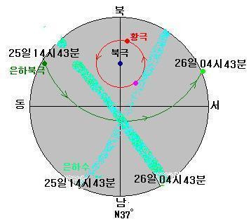 일주운동의 시간변화에따라 26일 4시43분경 은하의 북극이 서쪽산넘어로질 때 황극은