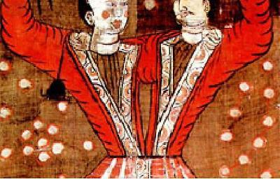 <형천> 염제의 신하로 황제와 권좌를 다투다 목이 잘렸다. 그 후 젖꼭지로 눈을 삼고 배꼽을 입으로 삼아 싸움을 계속했다.