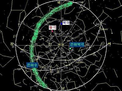 계절과 시간의 변화에 따라 황도가 변하고 이에 따라서 우리은하의 북극의 위치는 변한다.