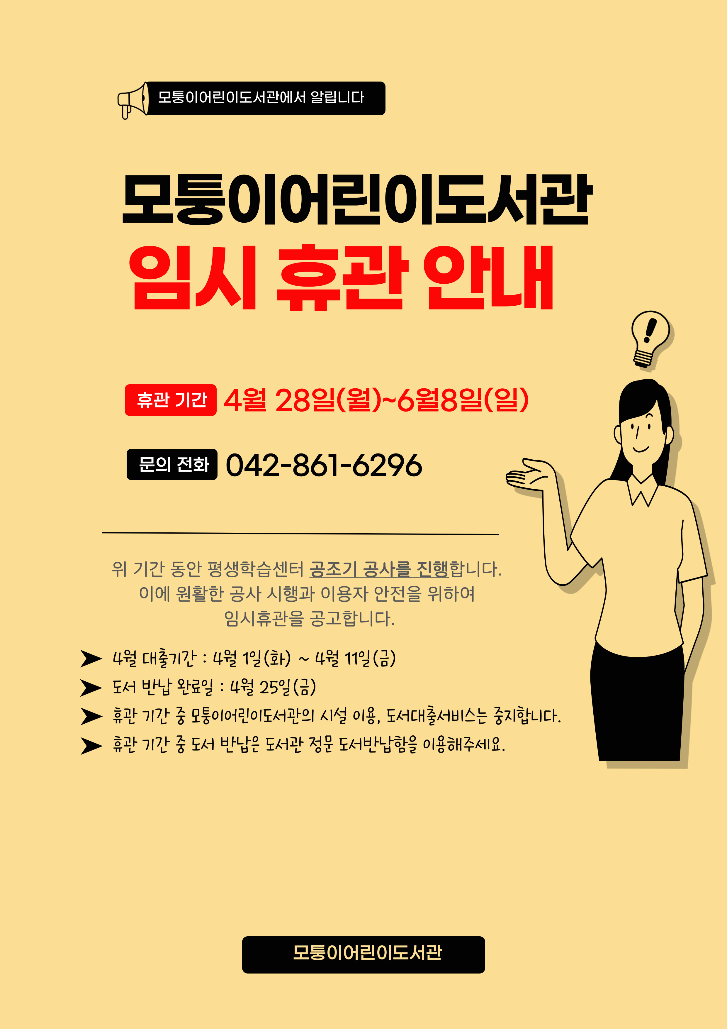 휴관공지 작성자정경미|작성시간25.04.03|조회수23 목록 댓글 0 글자크기 작게가 글자크기 크게가 [휴관안내] 4월 28일(월) ~ 6월 8일(일)평생학습센터 공조기 공사로 인해 휴관하게 되었습니다.도서관 이용에 차질이 생기지 않도록 일정 확인부탁드립니다.감사합니다.^^ 다음검색 현재 게시글 추가 기능 열기 북마크 공유하기 신고 센터로 신고 댓글 댓글 0 댓글쓰기 답글쓰기 댓글 리스트