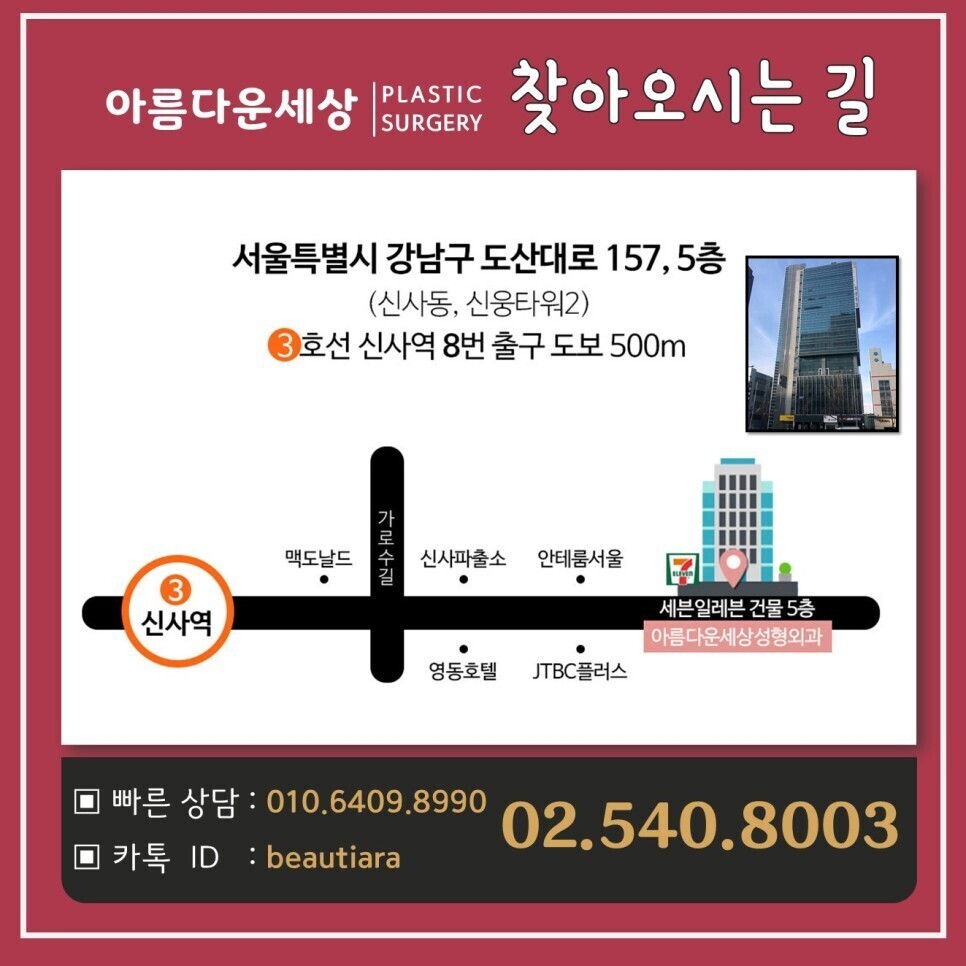 * 이 글은 아름다운세상성형외과 의 의료광고 이며, 모든 수술이나 시술은 부작용이 발생할수 있으므로 의사와의 충분한 상담을 하시길 바랍니다.