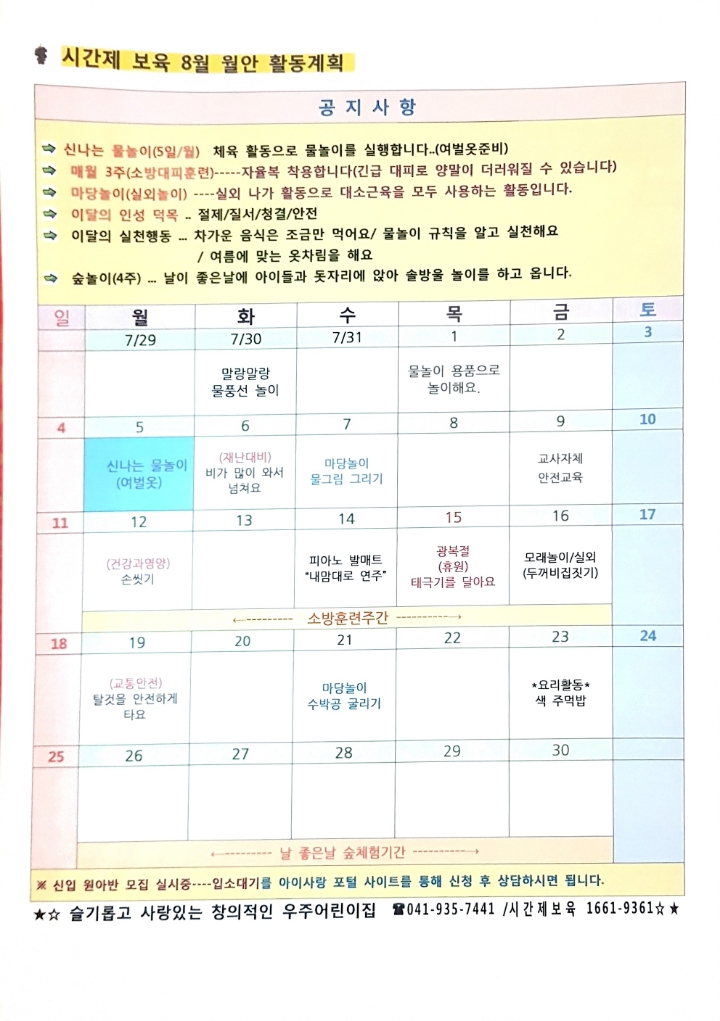 2019년 시간제반 8월 월안 작성자무지개슈니|작성시간19.08.12|조회수30 목록 댓글 0 글자크기 작게가 글자크기 크게가 무지개반 월안 계획표 입니다~계획된 활동은 원내 사정이나 날씨에 따라 변경될수 있음을 참고 부탁드립니다~ 다음검색 현재 게시글 추가 기능 열기 북마크 공유하기 신고 센터로 신고 댓글 댓글 0 댓글쓰기 답글쓰기 댓글 리스트