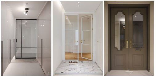왼쪽부터 차례대로 모던한 일자형 슬라이딩 중문, 몰딩을 더해 부드러운 분위기가 나는 여닫이 중문, 오픈된 현관에 중문을 달아 ㄱ자 구조로 만든 모습.